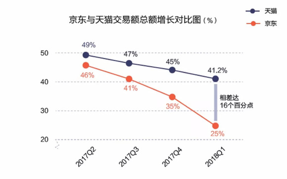 而根据Analysys易观发布的报告显示,京东2017年第二季度交易额总额为3353亿人民币,同比增长为46%;2017年第三季度京东交易总额为3025亿元,同比增长41%;2017年第四季度京东交易总额同比增长35%;2018年第一季度交易总额同比增长25.0%。