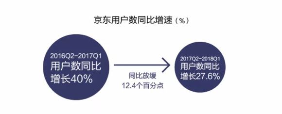 在用户增长方面,京东同样面临着瓶颈。根据京东2018年第一季度财报显示,截至2018年3月31日,过去12个月活跃用户数达3.018亿,同比增长27.6%。而去年同期这一数据为40%,同比放缓12.4个百分点。