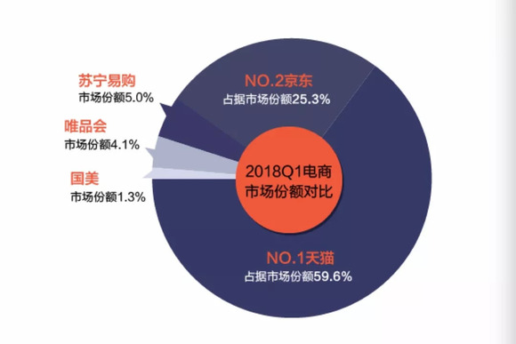 根据Analysys易观发布的《中国网络零售B2C市场季度监测报告2018年第1季度》数据显示,2018年第1季度,天猫成交总额较去年同期增长41.2%,占据市场份额59.6%,排名第一。京东成交总额同比增长25.0%,其市场份额为25.3%,排名第二。苏宁易购继续保持稳定发展的态势,其18年1季度的市场份额增长至5.0%,排名第三。唯品会和国美分别以4.1%和1.3%的市场份额占据第四和第五的位置。