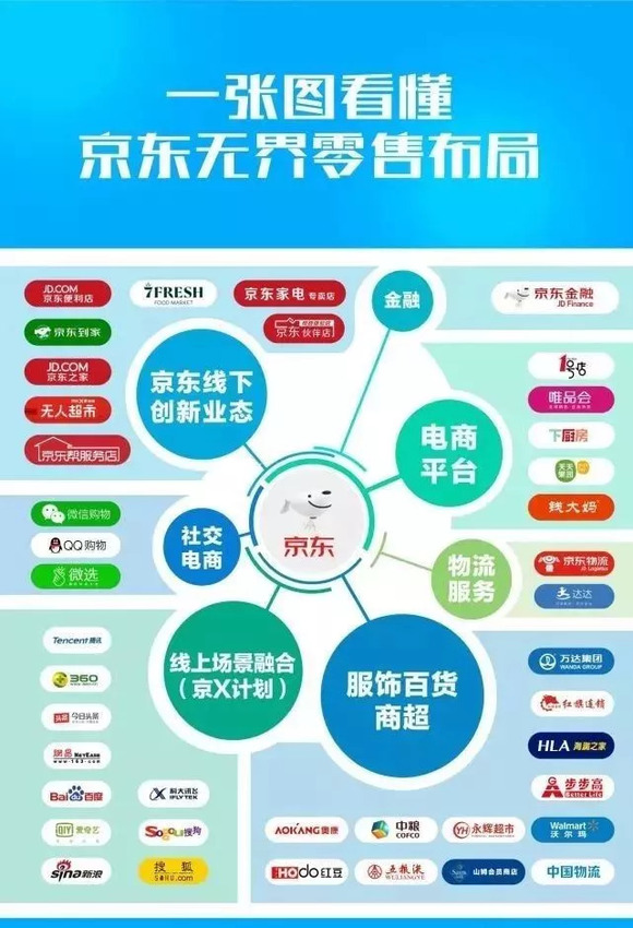 为了进一步推进消费场景的无界融合,为用户提供崭新的智慧零售消费模式,京东集团推出融合线上线下一体化的生鲜超市“7FRESH”,还联合腾讯先后战略投资了国内零售业巨头万达商业股份有限公司和步步高商业连锁股份有限公司,并于毅德国际控股有限公司等一批超级线下零售商建立了战略合作伙伴关系,共同打造线上线下融合的无界零售商业模式。