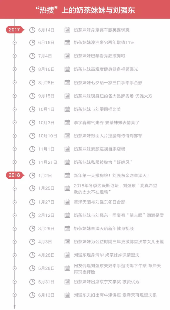 近几年,“刘强东夫妇恩爱生活场景”的对外形象不断得到强化,主要表现为三个步骤,第一步,去“奶茶妹妹”化,去除网红属性,强化京东老板娘概念。刘强东多次公开表示,“以后任何人如果再在我的面前提到奶茶妹妹四个字,不要怪我不客气!”。第二步,支持章泽天成立京东公益基金会,做慈善,进军时尚圈,塑造商界精英形象。章泽天投资Uber、茶饮品牌、互联网出行项目、在线教育等十余家公司,2017年入选达沃斯全球杰出青年大奖等。第三步,讲好爱情故事,秀出新高度。比如,每隔一段时间,网络上总会出现关于刘强东夫妇的爱情新话题。