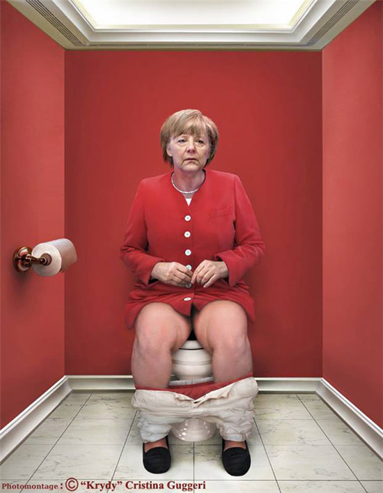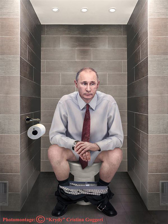 看过银幕上的“金正恩”拉了一裤子的屎之后,意大利艺术家Cristina Guggeri也灵机一动P了组这样的图片。总是风度翩翩的国家领导人们,一个个坐在马桶上或若有所思或暗暗用力,场面让人忍俊不禁。