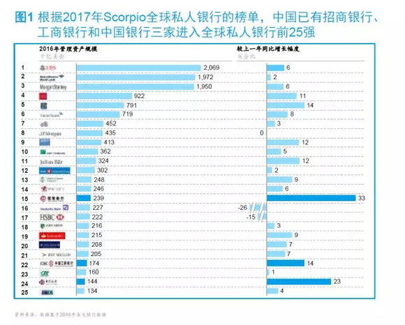 2007 年3 月,中国银行在北京成立了第一家私人银行部,开启了国内私人银行业务的先河。回首过去十年,在高净值客群财富加速积累的驱动下,私人银行业务在中国得到了长足的发展。根据2017 年 Scorpio 全球私人银行的榜单,中国已有招商银行、工商银行和中国银行三家进入全球私人银行前25 强。(见图1)中国的私人银行业已经迈入世界舞台。
