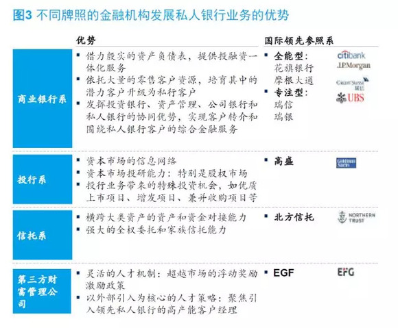依托殷实的资产负债表,强大的零售客户资源,覆盖投资银行、资产管理、公司银行的广泛业务组合,相比非银行金融机构和第三方财富管理机构,商业银行有从事私人银行业务独特的优势。(图3)