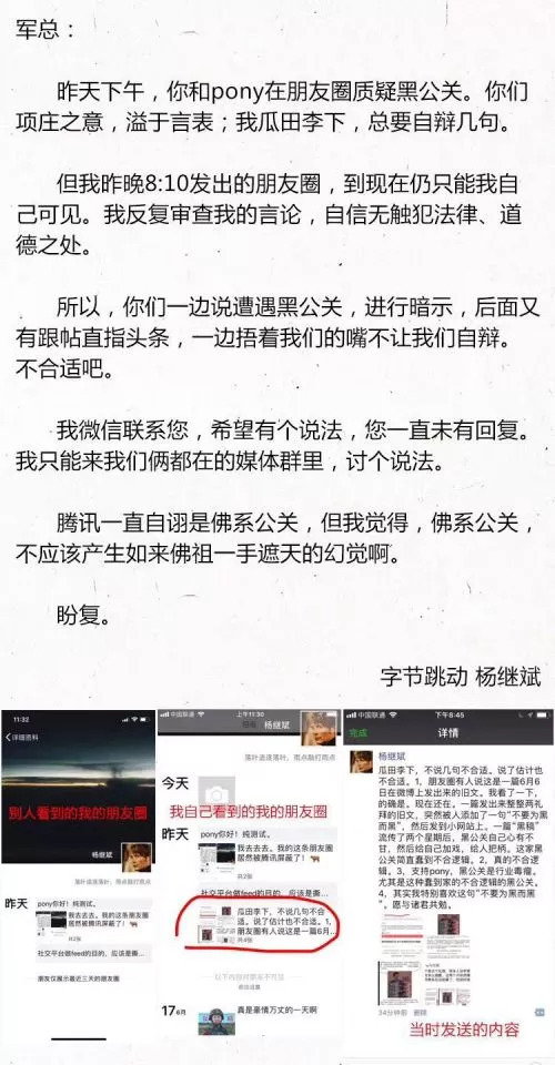 6月21日,字节跳动公关杨继斌在朋友圈回应张军,称自己瓜田李下,总要自辩几句。杨继斌还说,腾讯一直自诩佛系公关,但我觉得,佛系公关,不应该产生如来佛祖一手遮天的幻觉啊。