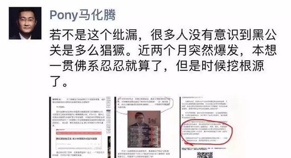6月20日晚,马化腾发朋友圈称,“若不是这个纰漏,很多人没有意识到黑公关是多么猖獗。近两个月突然爆发,本想一贯佛系忍忍就算了,但是时候挖根源了。”