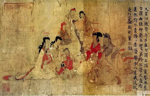 女史们身着下摆宽大的衣裙,修长婀娜,衣裙陪着形态各异、颜色艳丽的飘带,飘飘欲仙,雍容华贵,线条勾勒循环婉转、连绵不断、悠缓自然。西方美术界也把它视为中国古代绘画的代表作,赞誉“一切都达到圆熟境地”的“完美无缺的佳作”。