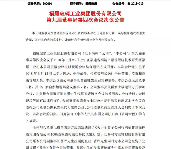 福耀玻璃发布全资子公司收购“福建三锋”董事会公告