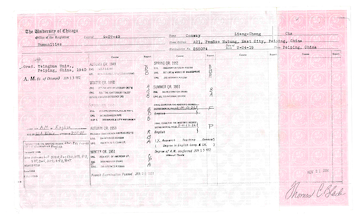 根据成绩单,穆旦是一九四九年九月二十七日入学的,英文名字是Conway Liang-Cheng Cha。在读期间选修的课程和成绩,依次排列如下: