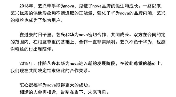 轰轰烈烈的张艺兴粉丝对峙华为的维权之争,以6月30日凌晨,张艺兴工作室发出“与华为和平分手”的声明而告终,华为方面至今没有发布公开声明。