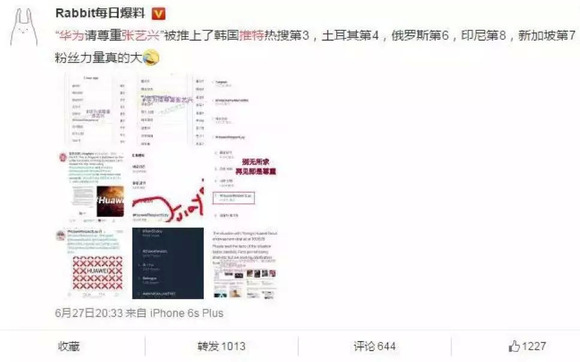 事件迅速演变成了张艺兴粉丝在全球范围内向华为讨说法,不止上了微博的热搜,推特的热门也没少上。