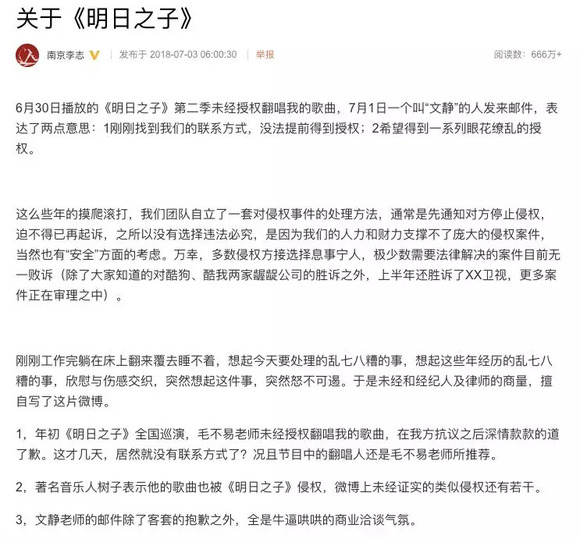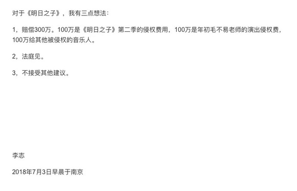 今日清晨,李志在微博撰写长文直指综艺节目《明日之子》第二季涉嫌侵权,其中选手邱虹凯演唱了李志的歌曲《天空之城》,该歌曲未曾得到李志方面的授权,且另外一个选手尹清也未拿到音乐人树子的授权演唱了歌曲《圆圈》,最终李志决定上诉《明日之子》并要求赔偿300万。