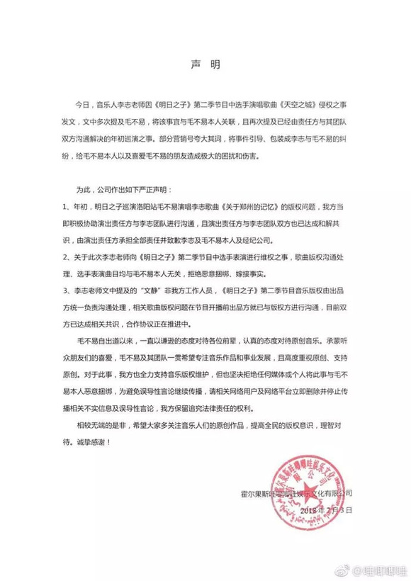 在李志发出声明的8个小时后,毛不易所属公司、《明日之子》出品方之一的哇唧唧哇在微博做出了回应,除了表示此前巡演的侵权行为已经达成和解不应再提之外,还有一个点较易被忽视,即“《明日之子》第二季节目音乐版权由出品方统一负责沟通处理”,换句话说,在哇唧唧哇看来关于此次节目中的歌曲侵权公司及毛不易个人不应承担相关责任,问题出在了出品方。