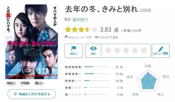 本片上映后,在日本影评网站得到了3.83分,豆瓣也有7.8分好评。