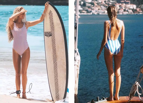 今年夏天的时髦泳装照,最简单的公式就是“条纹+复古滤镜”,本身就自带修身特性的“条纹元素”配上蓝绿色调的复古滤镜,八十年代黄金超模范儿简直随便拗。