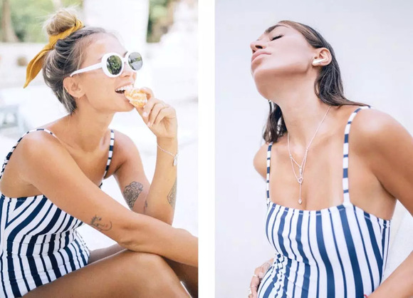 Ins上最多博主穿的这款水手条纹连体泳衣,相比Solid & Striped肩带更细,而且采用一字领设计,感觉更女性化,搭配简单的银饰叠戴就很漂亮。
