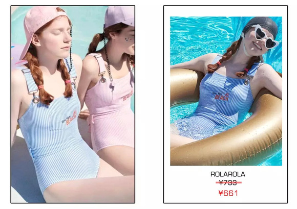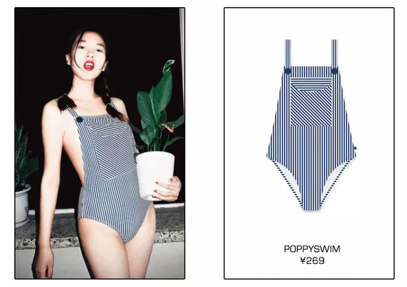 还有一种连体条纹泳衣中的奇葩——背带裤式连体泳衣,像本土设计师品牌Poppyswim和韩国少女系明星全孝盛、金世正等最爱的韩国品牌Rolarola推出的设计,穿起来都非常有洛丽塔的感觉。