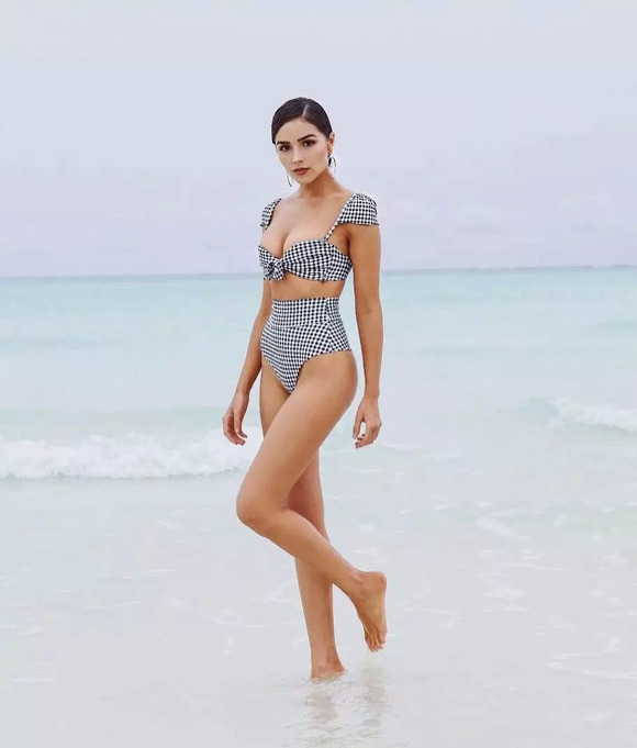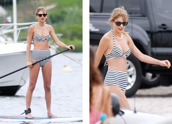 如果想要复古感更明显,一定要选择平角高腰的下装款式,图案上像Taylor Swift和Olivia Culpo这种黑白条纹或千鸟格的最佳。