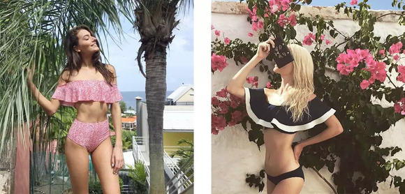 今年流行的荷叶边泳衣有个新名字叫“Flamenkini”,特指荷叶边上装搭配简单分体下装的比基尼,