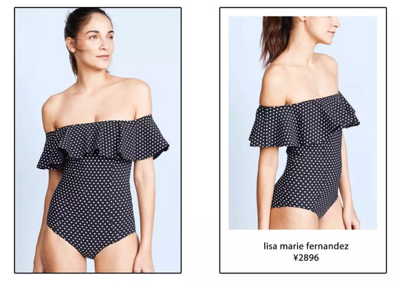 Norma Kamali就有非常类似的露肩宫廷袖褶皱波点泳衣,只不过是连体式,相比Chelsea Leyland穿的分体式少了点性感多了点优雅的感觉。