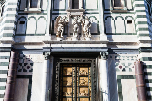 处于主教座堂佛罗伦萨大教堂的前方,大门共有两扇,每扇门上的浮雕作品都分为五块,采用圣经旧约传说中的十组故事为题材,由文艺复兴时期著名雕塑家洛伦佐·吉贝尔蒂雕刻于1452年。天堂之门完全用黄金制造,镀金的表面则使整个浮雕洋溢着一种黄金色的空气和轻雾的感觉。文艺复兴时期最伟大的雕塑家米开朗基罗对这组浮雕作品赞赏不已,也是他给予了作品以《天堂之门》的名称。