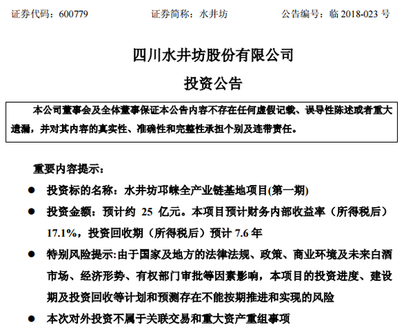 四川水井坊股份有限公司(以下简称“水井坊”)今天下午发布投资公告,预计总投资约25亿,扩建水井坊邛崃全产业链基地项目(第一期)。通过实施一期工程,预计将形成20000千升原酒生产能力,并在现有邛崃基地的基础上,预计增加40000千升的储存能力。该项目的建成,将进一步提升水井坊的市场竞争能力。