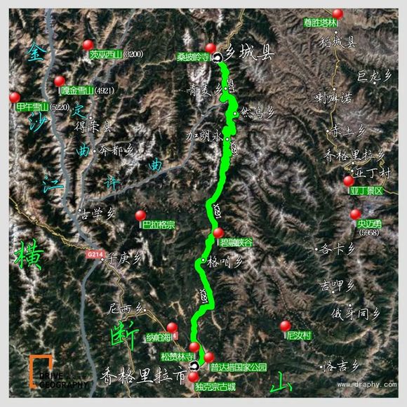 乡城县 17km 青麦乡 17km 然乌乡 70km 加朗永 46km 格咱乡 58km 香格里拉市