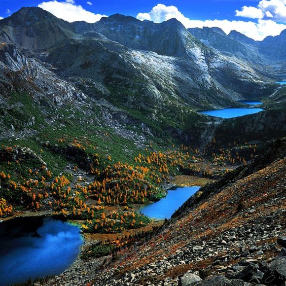 由7个高山湖泊沿梯级冰川谷串连排列而成的