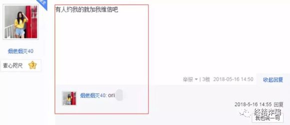 再比如在热门微博的评论区发评论,故意留下联系方式,组织人把这条评论顶上去,和贴吧的套路差不多。主要目的就是要通过网络“站街”,把人引流到键盘手的个人账号。