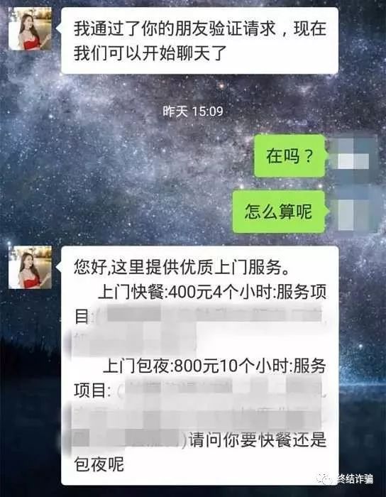 我们这行和婚恋诈骗不一样,色粉吸引过来之后,键盘手不会花时间和你谈情说爱,而是直奔主题。先把“自己”的身高、体重、三围、学历介绍一下,照片发过去,再谈价格。直接了当的做法,会增强信任感,让男人抵挡不住诱惑。当然,这些照片都是从网上下载或者是找模特拍好的,和实际上门服务的绝不一样。