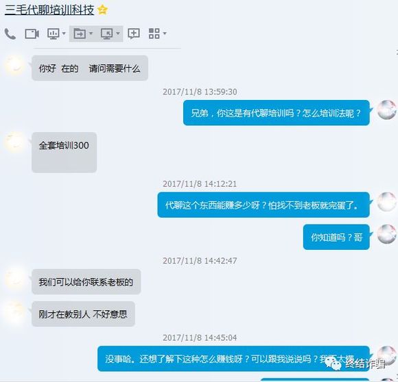 也有些男人比较小心的,有的要打电话确认,有的要求语音或视频。打电话、发语音我们是允许的,机房或者散键盘工作的地方要至少保证有一个女人,可以应付这些请求,要求视频的话就以行规为由直接回绝。有的散键盘是夫妻档,老公负责聊天,老婆一边做家务,一边应付有语音要求的人。