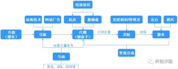 看完这些黑话,你应该对我们这个行业链条有了一个大概的了解。大概说来就是先通过键盘手“站街”招揽色粉,然后再提供线下色情服务或诈骗。下面我就逐一进行讲解,将这个很少见人的行业内幕尽可能说得清楚。