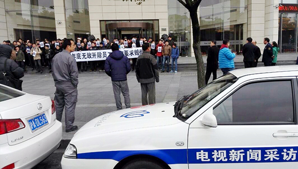 1月30日早上,光大银行上海分行部分信用卡营销人员,因对信用卡逾期率营销人员考核标准不满而聚集在上海分行门口拉起抗议横幅。