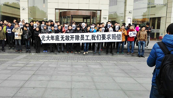 2015年1月30日上午,有新浪微博网友“幽灵礼物”爆料称,上海世纪大道商城路光大银行上海分行门口聚集了一批手举横幅的员工,聚众员工声称“光大银行年底无故开除员工,我们要求赔偿。”