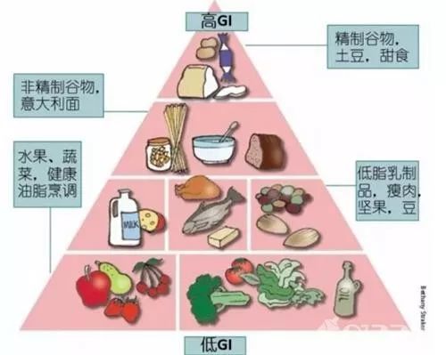 低GI食物:GI<55,如:牛肉、大多数绿叶蔬菜、鸡蛋、豆腐、苹果