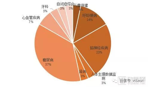 在2018上半年,共有26款产品针对的是慢病的监测或者诊疗,占绝对的主导地位,其中,占比最高的是糖尿病,比例达37%、其次为包括脑卒中、癫痫在内的脑神经疾病,以呼吸暂停为主的呼吸疾病紧随其后,其余慢病包括心血管疾病、肾病等。产品形态以可穿戴设备/智能硬件+APP/配套系统为主。