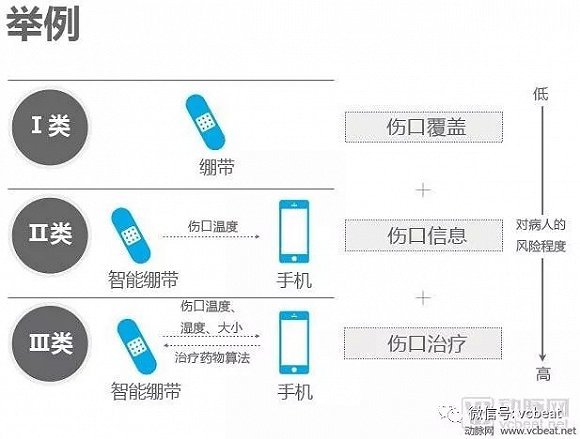 在此前的报道中,我们还以绷带为例,说明三个类别之间的区别:普通绷带仅仅是覆盖伤口无其他作用,则归属Ⅰ类;与手机连接,能够通过应用查看伤口温度,且不小心还可能伤口感染,对会诊会有轻度风险,归属Ⅱ类;连接手机后,不只能显示伤口相关信息,还能通过药物算法给予患者反馈、指导等,归为Ⅲ类。