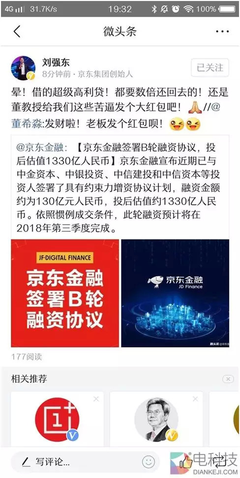 7月15日京东金融宣布与中金资本等投资人签署增资协议,B轮融资130亿元人民币,投后估值1330亿元人民币。对于刘强东获得的百亿融资,中国人民大学重阳金融研究院高级研究员董希淼呼吁刘强东发红包,而刘强东却罕见“哭穷”:借的超级高利贷!都要数倍还回去的!还是董教授给我们这些苦逼发个大红包吧!