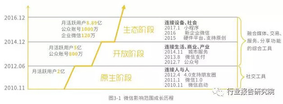 2017年,腾讯研究院发布了《微信社会经济影响力研究报告》。报告中显示,截止至2016年12月,月活跃用户8.89亿,公众账号1000万,企业微信120万。同时,在型企业微信、小程序上线等功能不断开发和开放中,已经成为融合了媒体、交易、服务、分享功能的综合工具,已经从原生阶段、开放阶段步入生态阶段。