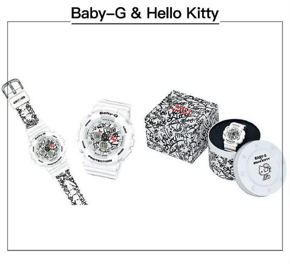 在手表装饰上,卡西欧的Baby-G向来都是年轻女生们追捧的对象之一。为了让更多的女生们不再犹豫和纠结,Baby-G也同Kitty合作推出了Kitty版BA-120KT-7A手表,加入了独特的街头涂鸦,透出一股时尚感。不知有多少男生给自己喜欢的女生入手了这款集可爱和时尚于一体的Baby-G啊。