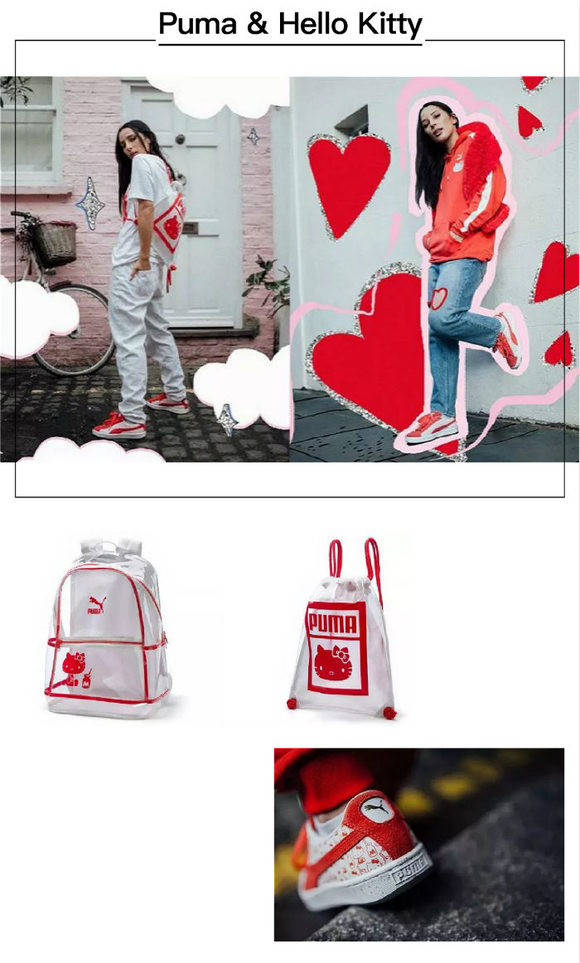 在Puma迎来Suede Sneaker 50年周纪念日时,同Kitty联名合作设计了经典坐立造型的鞋子。红色的基调让Kitty更显甜美,深受女孩们的喜欢。除了特别推出的Kitty鞋,Puma还推出了Kitty版卫衣、短袖、牛仔裤、背包和帽子等。带上棒球帽,背上背包,穿上卫衣和牛仔裤,再来一双板鞋,Puma和Kitty版的全新穿搭Look便大功告成。