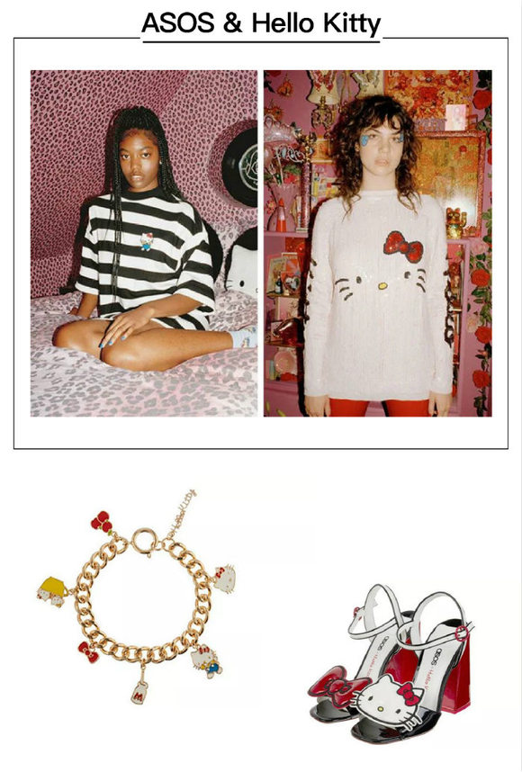 英国线上零售商及自有品牌ASOS同Kitty合作,也推出了40件单品的服饰联名系列。调皮的T-shirt,不对称的粗跟凉鞋、伴有头像、蝴蝶结和牛奶瓶的手链以及Kitty大脸的耳环,让众多少女们心动不已。此外还有毛衣、袜子和手袋Kitty款,想必在40件单品中总有一款是你心仪的那个。