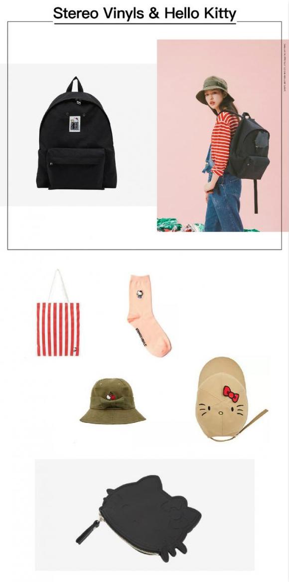 这样一来,戴着Stereo Vinyls的帽子,穿上BAPE的白T,背上Ne-net的背包或拿上Stereo Vinyls的环保塑料袋,戴上ASOS的手链和耳环,穿上Stance的袜子,搭配Puma的板鞋或ASOS不对称的粗跟凉鞋,一身Kitty Look便可以隆重登场了。
