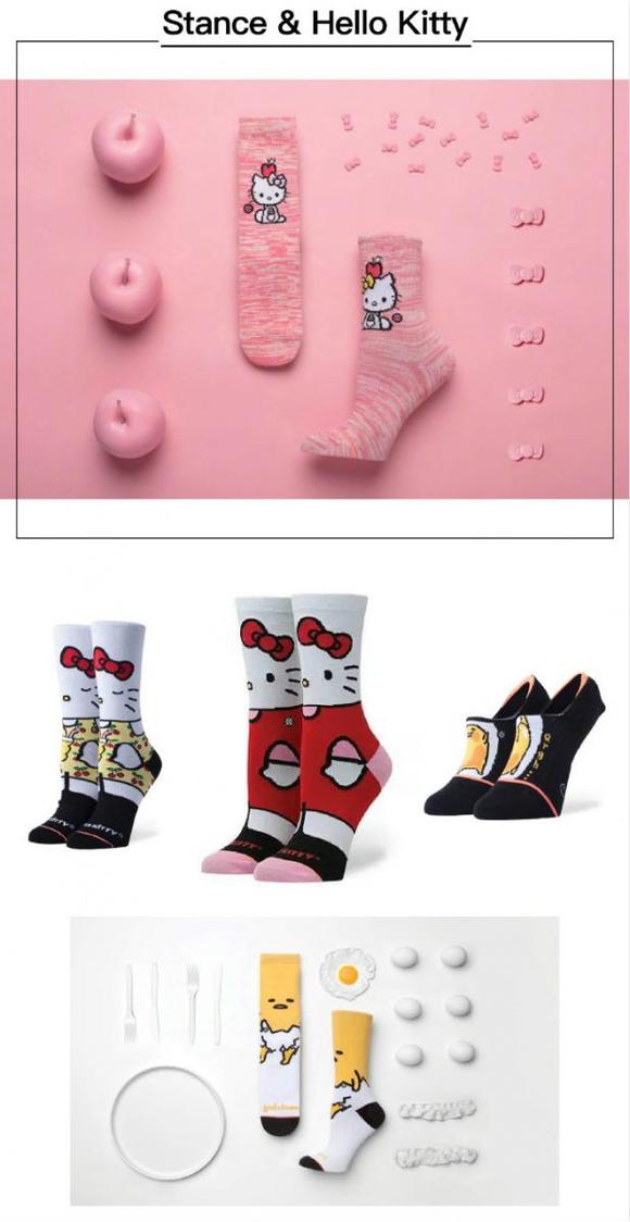有那么多同Kitty联名的T-shirt、裤子和鞋包,袜子也当然不能输在起跑线上。美国加州著名的袜子品牌Stance也同Kitty联名,把Kitty版可爱小巧的袜子穿在脚上也是一个别致的想法,品牌可爱的设计和童真的形象唤醒了大多数人们心中的孩子气。