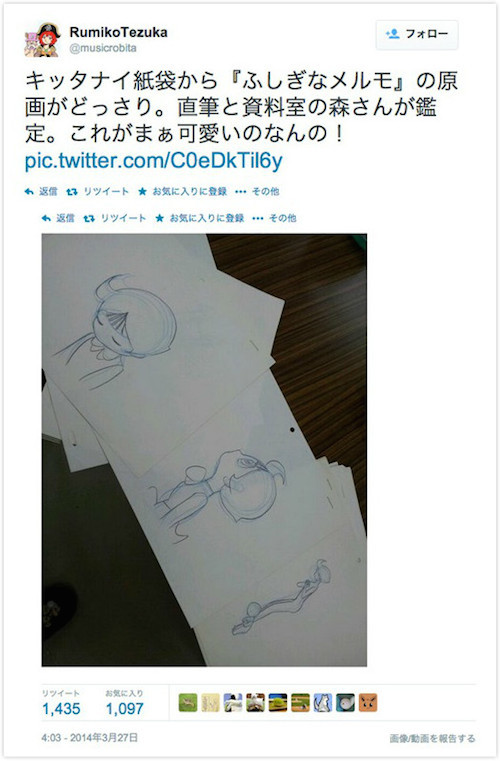 “从一个脏脏的纸袋里发现了《神奇的美乐蒙》的原稿。资料室的森桑给鉴定过了,是父亲亲笔画的。马马虎虎算是可爱吧!”