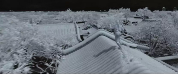 “雪屋顶的这一场虽然镜头不多,但是它的难度对于我们来说却是相当大的。”周逸夫解释,雪屋顶比其他雪景难的地方在于雪的交互,如何让雪的质感更真实,如何让每一个脚印和奔跑时溅起来的雪花都达到真实质感,特效团队为此专门进行了一段时间的测试。“在磨合一段时间之后导演觉得我们可以胜任做雪屋顶这样难度较高的场次,所以让我们做了测试,最后顺利通过的。”李天然在雪屋顶奔跑的镜头由此而来。