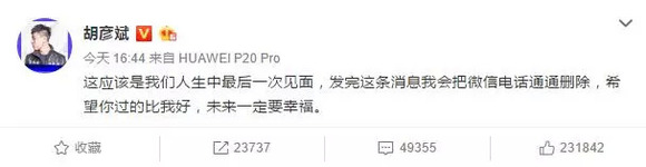 胡彦斌亲自发微博称:“这应该是我们人生最后一次见面,希望你过的比我好。”