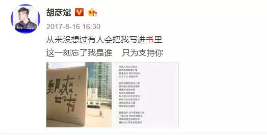胡彦斌特意为此发了个微博,说“从来没想过有人会把我写进书里,这一刻只为支持你。”