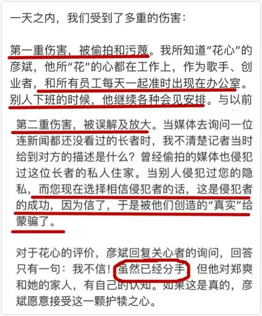 他借用胡彦斌的微博发布了一篇长文,一方面明确了两人的分手,一方面也对“花心”这事做出了解释。