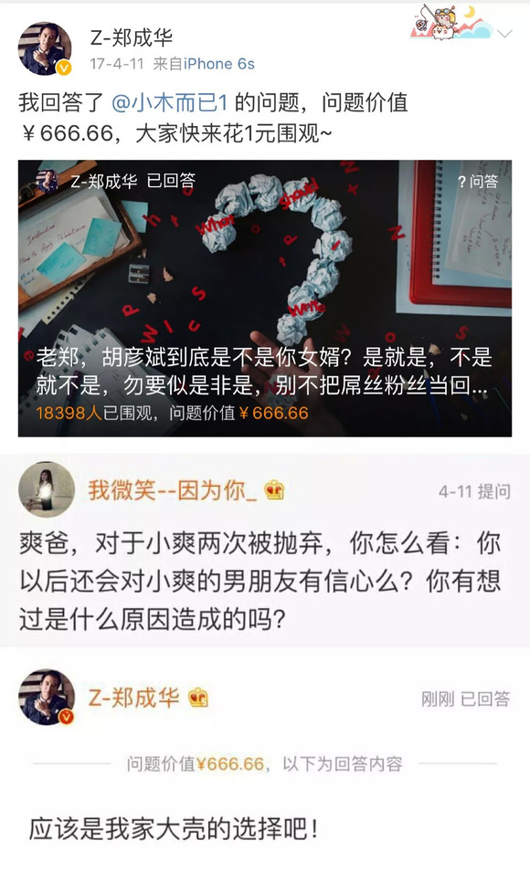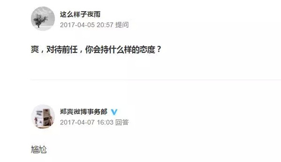 2017年4月份的时候,郑爽和她父亲突然开始在微博上大批量回答网友问题,其中不少都涉及到胡彦斌和以前的恋情。